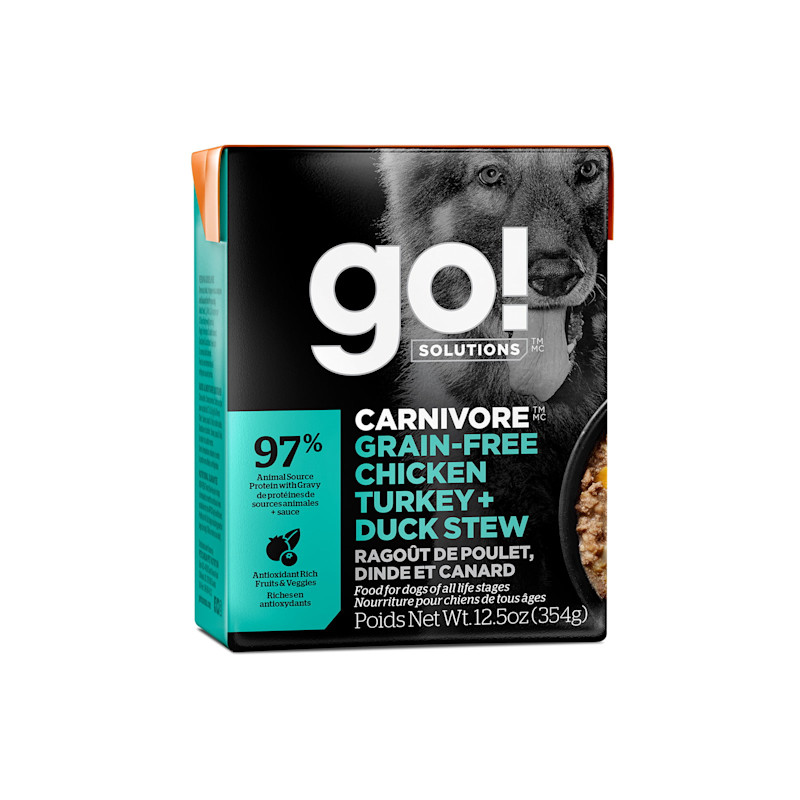 Crude protein (min) 9.5% Crude fat (min) 2.5% Crude fiber (max) 1% Moisture (max) 82% Go! Solutions Carnivore Grain-Free Chicken, Turkey + Duck Stew is formulated to meet the nutritional levels established by the AAFCO Dog Food Nutrient Profiles for All Life Stages including growth of large size dogs (70lbs or more as an adult).